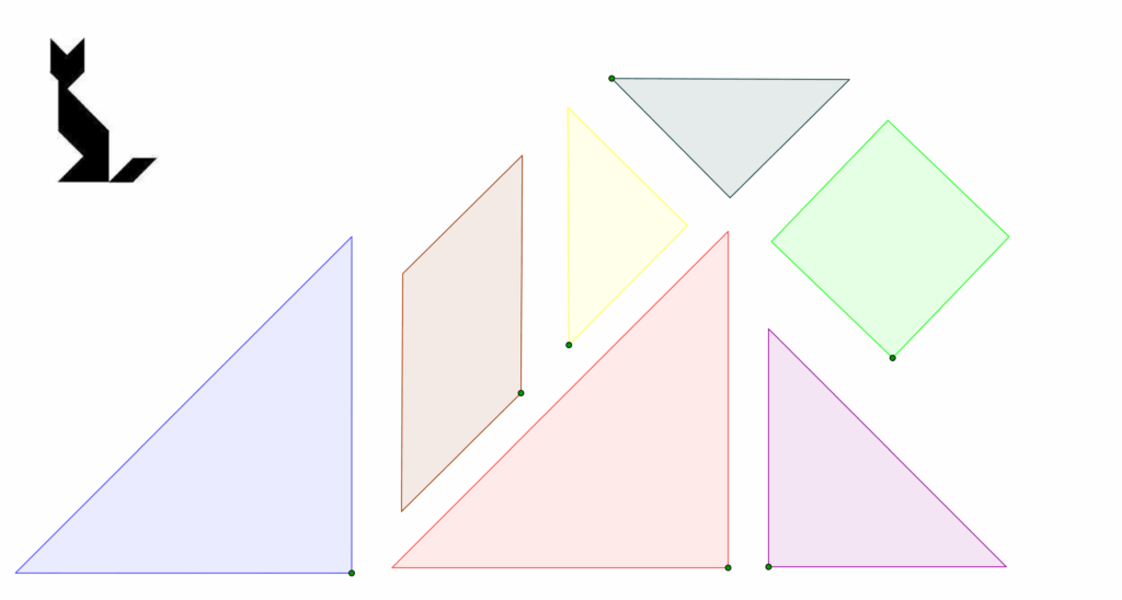 W razie pojawiających się problemów ze zbudowaniem poszczególnych elementów gry odpowiednich rozmiarów, możemy zaproponować uczniom konstrukcję szkicu – wzorca układanki. Postępujemy analogicznie jak na lekcji, na której uczniowie wykonują tangram z kartonu (zobacz również), podając serię poleceń do wykonania w GeoGebrze